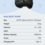With the ultra-high-speed motor, Max Boat Pump can easily reach 142L/min airflow and up to 12kPa / 1.7PSI high pressure. Max Boat Pump is a 2500mAh rechargeable lithium battery powered and completely cord-free. It is very easy to operate and can be used at any time